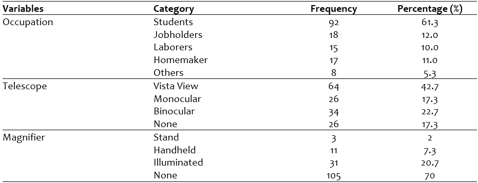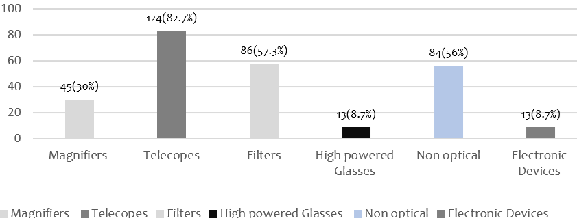 Fear of being perceived as blind N=120 (80%) followed by difficulty in handling the device N=106 (70.7%) and low affordability N=106 (70.7%), visual fields restriction N=103 (68.7%), discomfort N= 94 (62.7%) were the major barriers for not using low vision devices. The other barriers can be seen in table 2. Most patients were prescribed by Telescopes followed by filters and non-optical devices. (Figure 1)