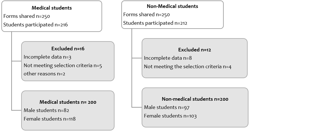 Sample size: Sample size was calculated using Raosoft by using a confidence interval of 95% and 5% margin of error and 30000 as population size, giving us n=385 as sample size. To make 2 strata for medical and non-medical students, this number was rounded off to n=400 including n=200 medical and n=200 non-medical students.