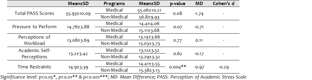 There is no significant difference (p≥0.05) in the total PASS scores as well as individual domains between the medical and non-medical students, except for the time constraint where medical students showed significant time constraint (p=0.004) with a small effect size (Cohen’d=0.29) as compared to nonmedical students. (Table 1)