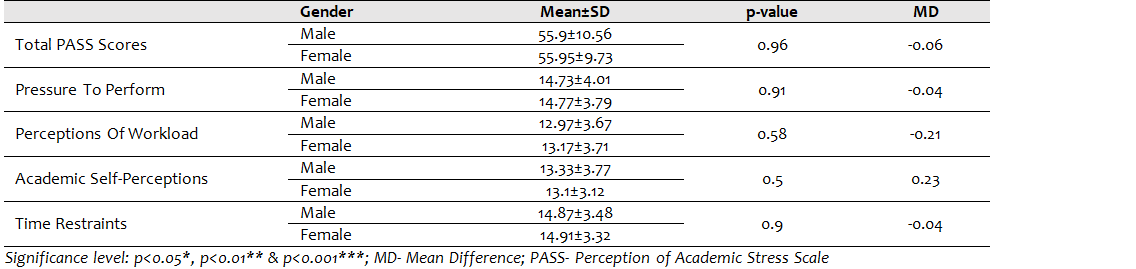 This study also indicates that there was no significant difference in the total PASS scores among Male and Female Undergraduate students favored by previous studies [14], while another study [8] had results different from the findings of the current study where male students had a higher perception of Academic stress. Few other studies [1] [20] [17, 21, 22] have revealed that females have a higher level of perception of Academic stress because they had female participants in the majority. Some studies explain this difference due to traveling restrictions on females in most Arab countries. This may be due to the fact that males and females both are career-oriented in this era in order to secure their future and also due to the environment and management practices of the universities[14]. So, Male and female students have no significant difference in their perceptions of Academic Stress according to this study. According to findings from this study, there was no significant difference in Pressure to perform and academic self-perceptions on the perception of Academic stress in both genders but previous literature[19, 23] showed that these factors have a significant effect in females. This can be explained due to societal factors as competence for excellence in a male-dominated society and the fight for financial independence.