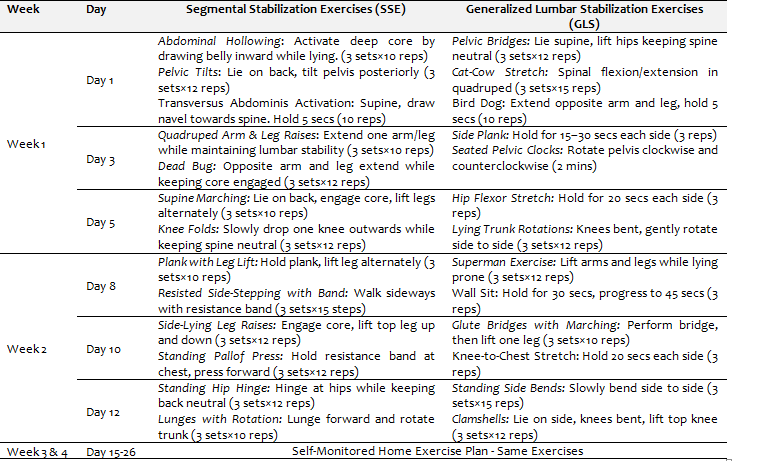 Table 1: Intervention protocol segmental stabilization and generalized lumbar stabilization exercise plan