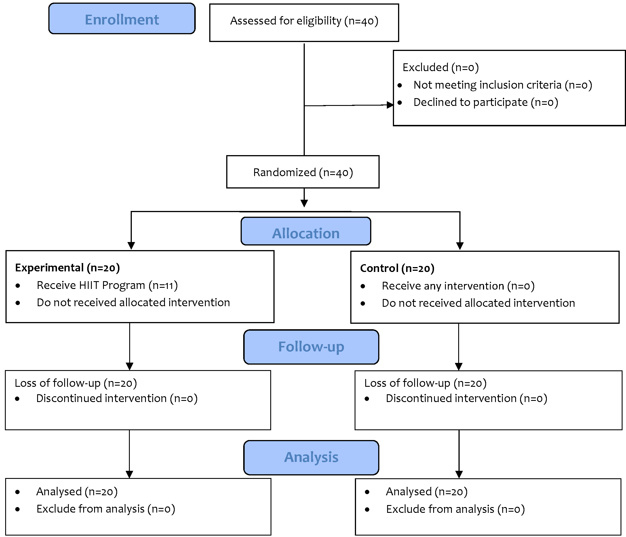 Methodology: A randomized clinical trial was conducted on n=40 female participants between 13-19 years without any serious medical, physical, or psychological illness for 6 months. All participants (n=40) were randomly divided into experimental (HIIT) and control groups equally. The protocols were performed in 4 mins in the first three weeks, 8 mins in the 4th to 6th week, and 12 mins in the 7th and 8th week, with sessions thrice a week. Data on cognitive flexibility was collected at baseline, after 4th week and 8th week from both groups through Digit Span (DST).