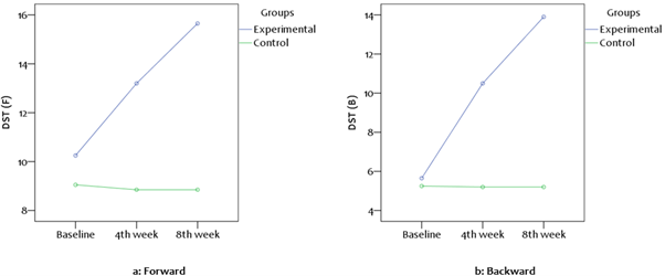 For Group Analysis, an independent t-test was run and significant results (p<0.001) were obtained in the experimental group for DST (forward and backward) after the 4th week and at the end of the intervention after the 8th week as compared to the control group. (table 3)