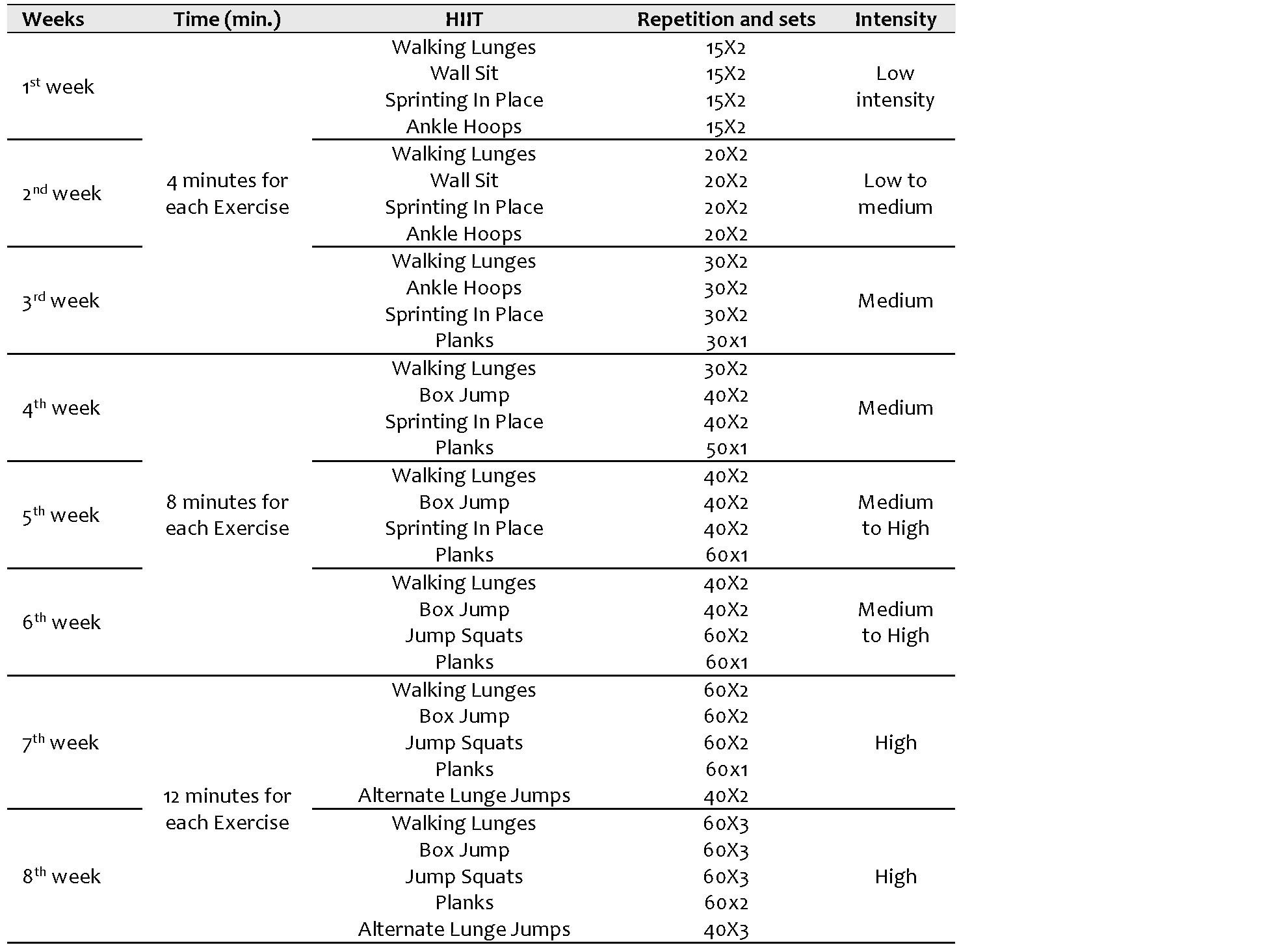 Intervention: The HIIT sessions ranged from 4-12 minutes in duration for 8 weeks in which three sessions were conducted each week (weeks 1-3: 4 minutes; weeks 4-6: 8 minutes; weeks 7-8: 12 minutes respectively), with a work to rest ratio of 30sec: 10sec, as mentioned in table 1. The experimental group/HIT group engaged in their HIIT sessions (inclusive of a short warm-up activity including dynamic exercises i.e., walking/running, 8-10 minutes of HIIT, and cool down which includes static exercises i.e., shoulder and hip muscle stretches). Session duration and intensity were increased with weekly progression in intervention groups. The high-resistance training sessions were delivered by the researcher to the HIT group, as mentioned in Table 1