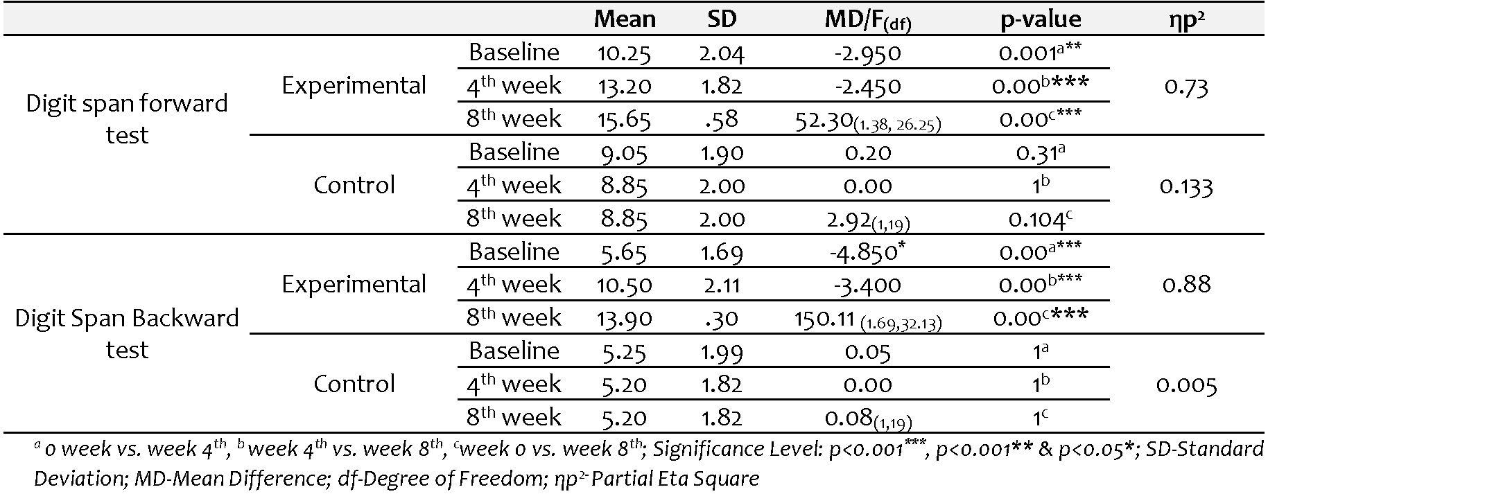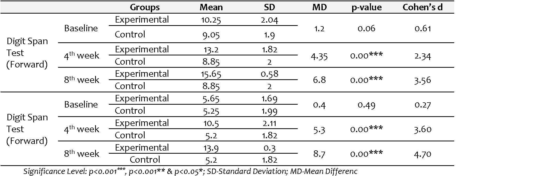 In the With-in group analysis, the experimental group showed significant improvement (p<0.001) at each level of assessment of DST (forward and backward) till the 8th-week session with a large effect size whereas the non-significant improvement (p≥0.05) has observed in the control group. (Table 2)