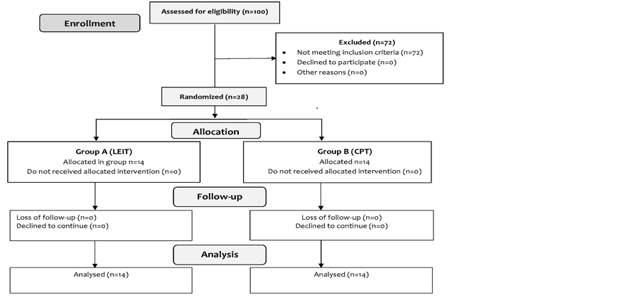Sample Size: Using G-Power, keeping the effect size small (0.24), α error margin at 0.05 and to avoid β error probability, the power (1- β) was set at 0.95%, and the sample size calculated was n = 28. A total of n=100 patients were assessed for eligibility through the non-probability convenience sampling technique and 28 participants fulfilled the inclusion criteria.