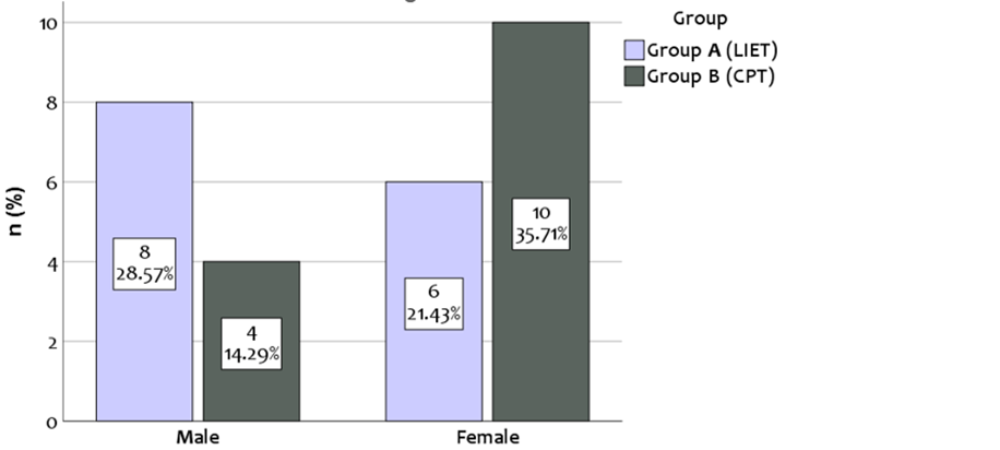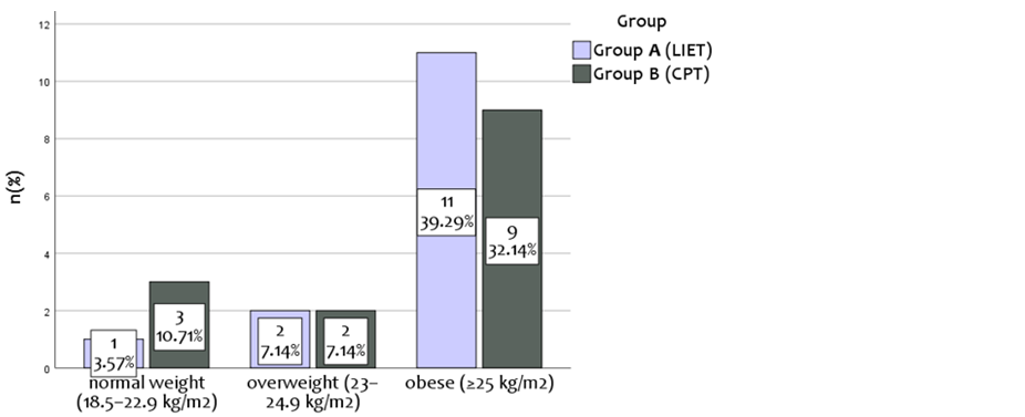 The mean age of study participants of Group A was 51.92±9.106 years, whereas Group B had 50.29±5.483 years. The gender (p=o.12) and the BMI (p=0.54) are normally distributed in both groups. (Figure 2 & 3)