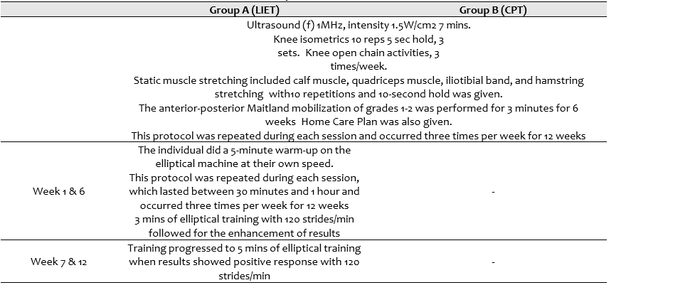 Treatment Group A (Conventional Physical Therapy and low impact Elliptical Training): received electrotherapy sessions (Ultrasound (f) 1 MHz, intensity 1.5W/cm2, 7 mins), isometric exercises (10 reps, 5 sec hold, 3 sets), and open chain activities for 40–50 minutes, 3 times per week. Before and following elliptical training, each participant undertook static stretching exercises. Static muscle stretching included calf muscle, quadriceps muscle, iliotibial band, and hamstring stretching with10 repetitions and 10-second hold for each leg.