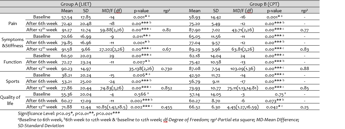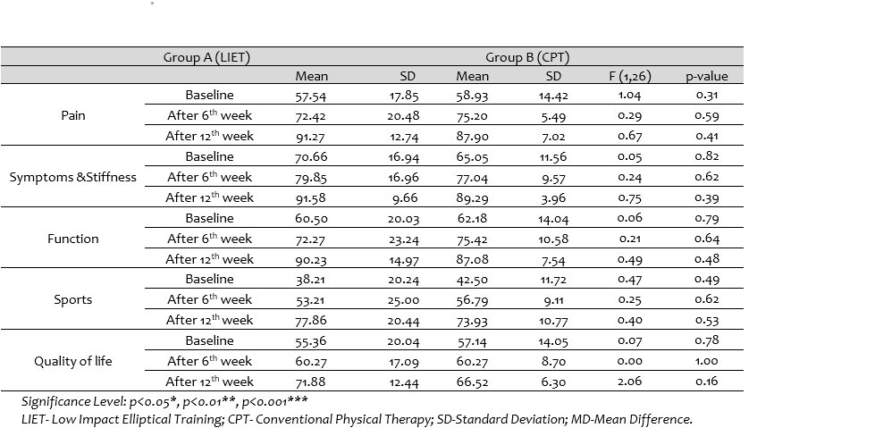 Within-group analysis, the domains of the KOOS for Low Impact Elliptical training there is no significant difference within the groups in all its variables, pain, stiffness, ADLs, Sports, (p> 0.005) except QOL of Conventional Physical therapy training initially there was a no improvement from baseline to week 6 then from 6th week to 12th week, but generalized improvement has been seen from baseline to 12 week {F= 10.855(1.427, 18.55), p-value 0.002, ηp2=0.455}. However, an overall improvement has been observed within the group of CT. (Table 3).