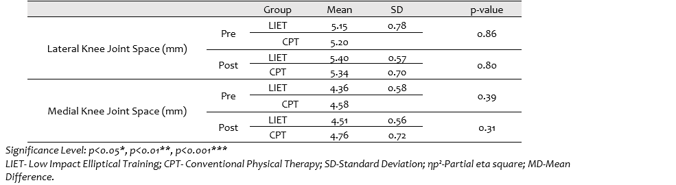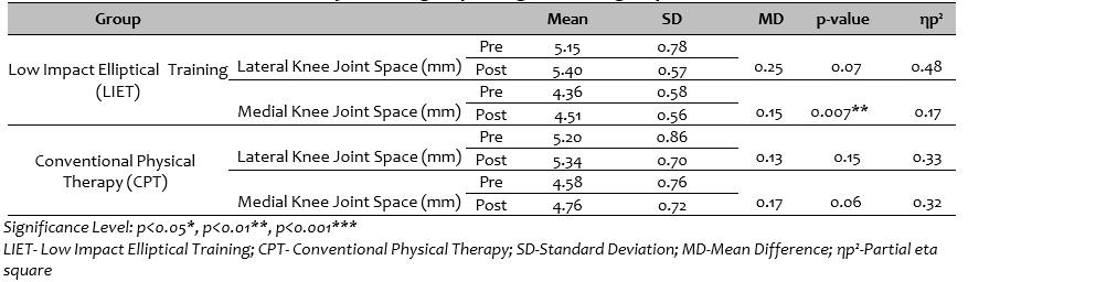 Results: 51.92±9.106 years was the mean age of group A study participants, and 50.29±5.483 years for group B. Within-group analysis, all domains of the KOOS for the low-impact elliptical training group showed significant improvement (p≤0.005). Between-group analyses, all the domains of the KOOS showed a non-significant difference with p≥0.05. In the between-group analysis of the knee joint width of the medial and lateral spaces in pre- and post-observation, there was no significant difference noted, but within the group, significant improvement (p=0.007) was observed in the medial space for the LIET group only