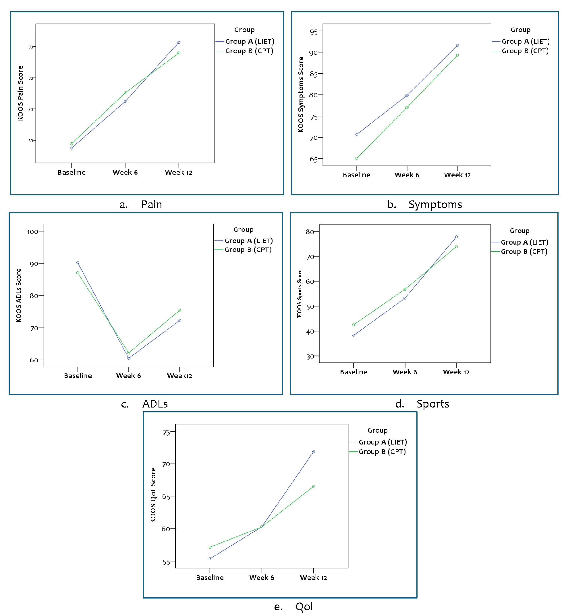 While assuming the sphericity, there is no homogeneity in the variance, whether the sphericity was assumed or not, there is no significant difference in the individual in the domain of KOOS with the level of assessments. There is no significant interaction effect regarding KOOS, pain {F= 1.058(2, 52), p-value 0.346}, symptoms {F= 0.053 (2, 52), p-value 0.608}, ADLs {F= 1.379 (2, 52), p-value 0.261}, sports {F= 2.394 (2, 52), p-value 0.101} and QOL {F= 1.177 (2, 52), p-value 0.316}. (Figure 5)